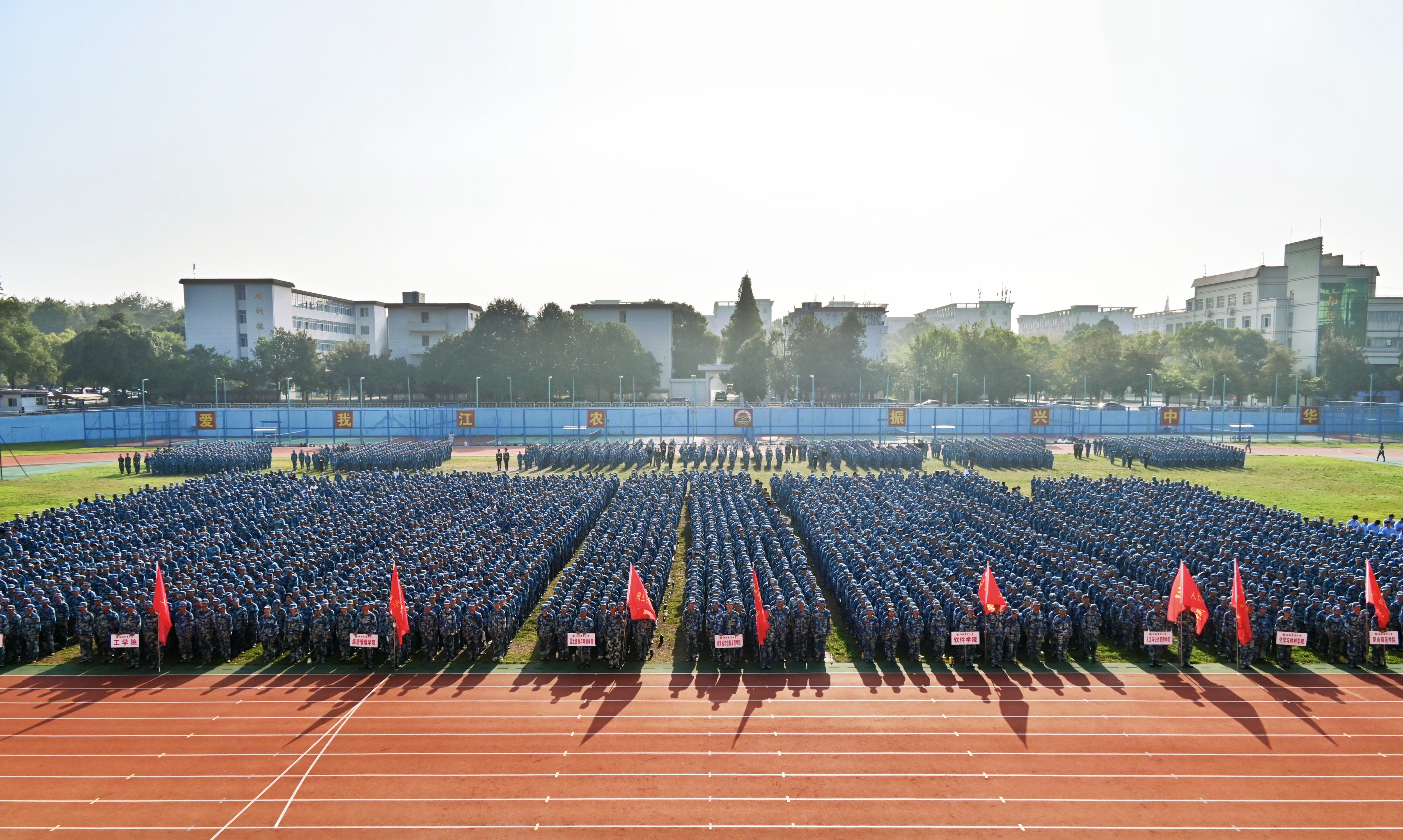 典礼在雄壮的国歌声中拉开序幕。2023级全体新生进行军训汇报,14支方队阵容整齐划一,步伐铿锵有力,依次从主席台走过接受检阅,赢得师生阵阵掌声。