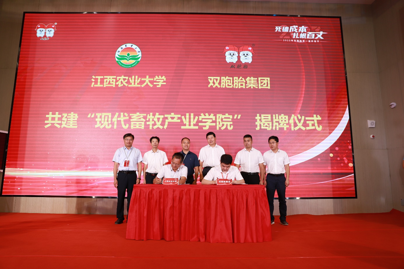 8月11日,应双胞胎集团邀请,欧冠副校长贺浩华、教务处、科技处、动科院负责人及教师代表出席在南昌举办的“2023年双胞胎第一届养猪节”,并参加“现代畜牧产业学院”揭牌仪式,双胞胎集团董事长鲍洪星、双胞胎集团养猪产品线总裁赖志军及企业相关部门负责人共同出席。