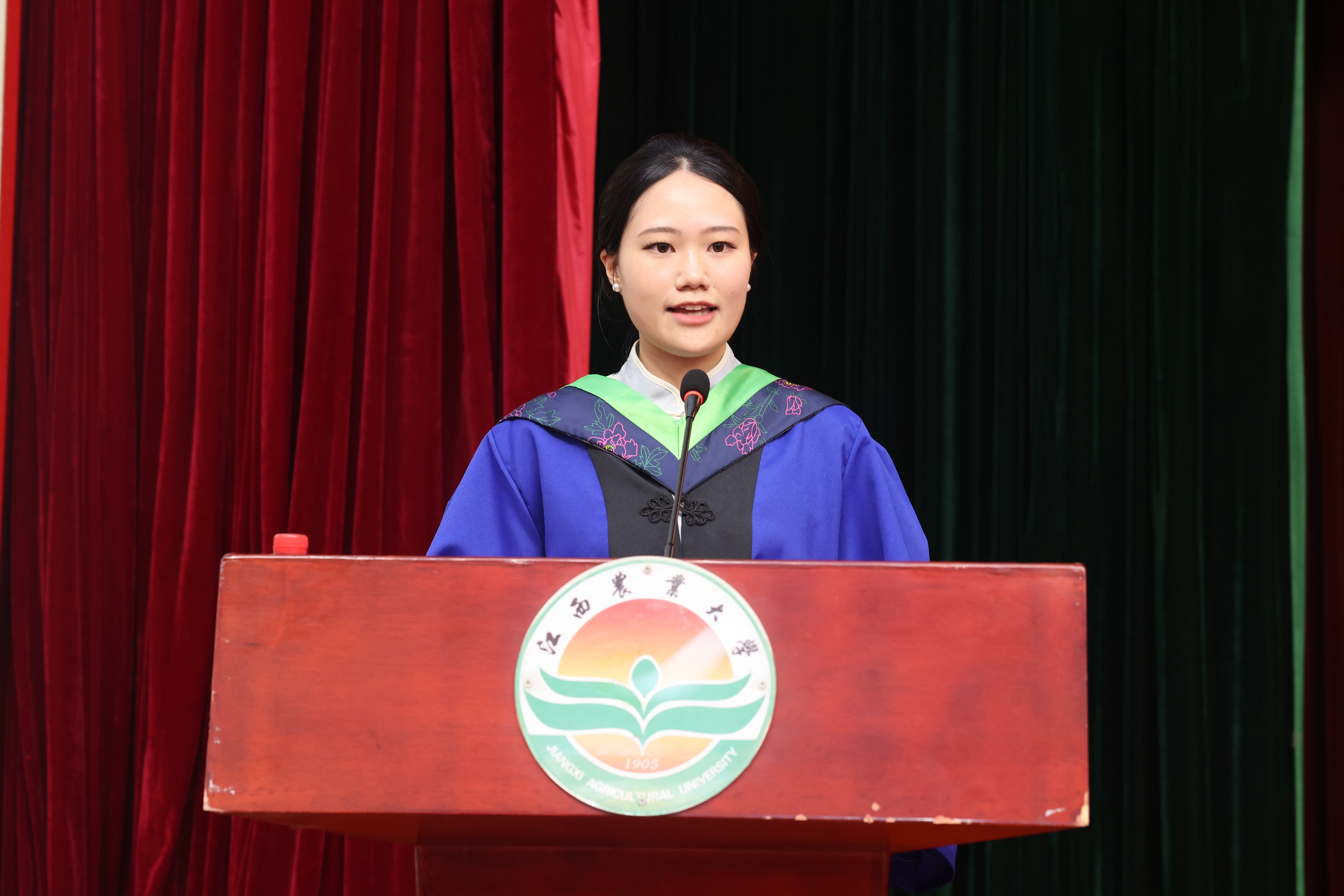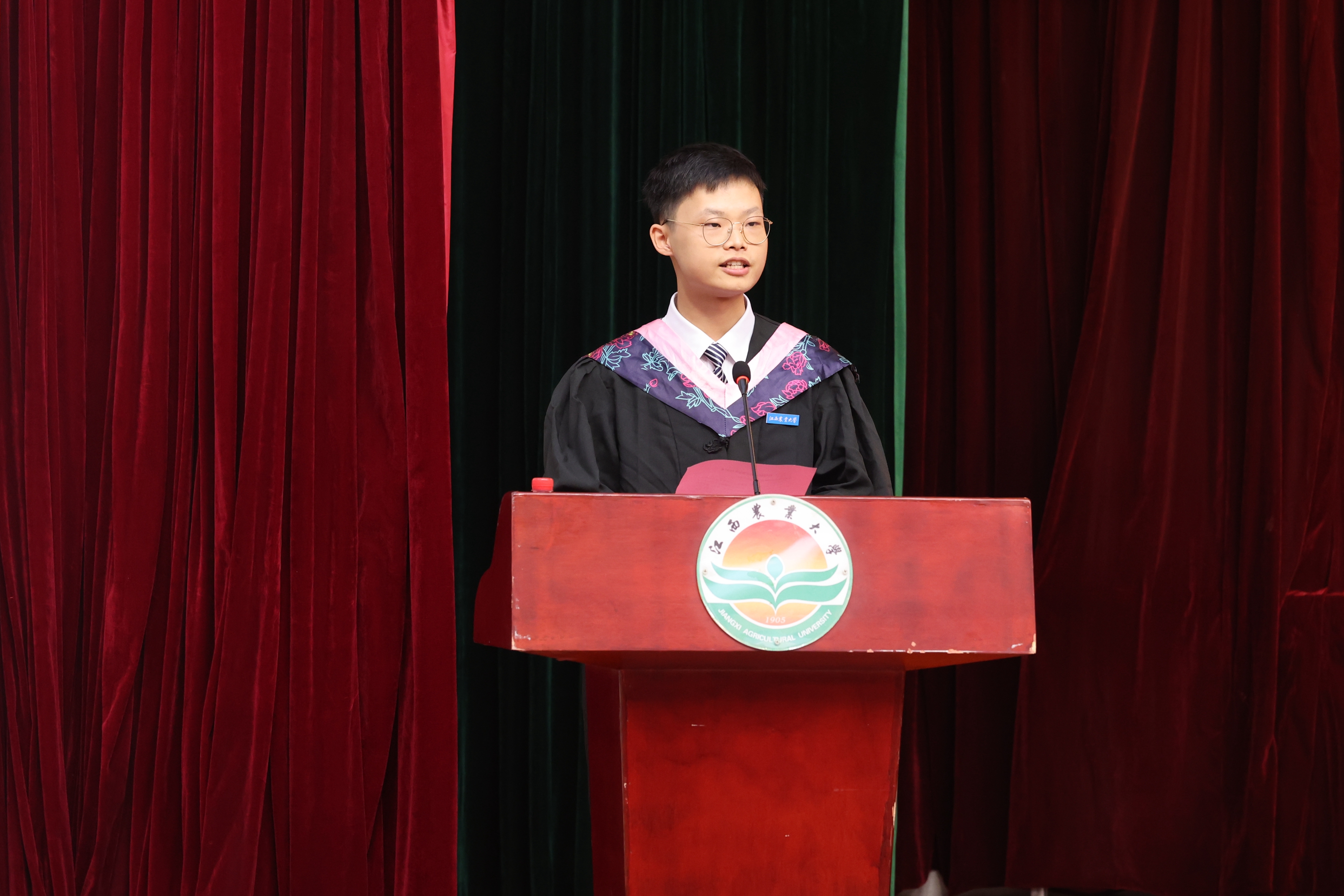 教师代表、农学院博士生导师周庆红教授,本科毕业生代表、国土资源与环境学院2019级土地资源管理专业朱文哲同学,研究生毕业生代表、林学院(园林与艺术学院)2020级林木遗传育种专业熊启慧同学,在校学生代表、马克思主义学院2021级思想政治教育专业杨其坤同学在典礼上先后发言。