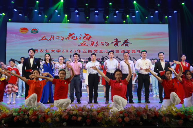 为深入学习宣传贯彻党的二十大精神,大力弘扬五四精神,加强爱国主义教育,丰富校园文化生活,展现农大学子朝气蓬勃、积极向上的精神风貌,教育引导广大青年在乡村振兴的大舞台上建功立业,5月4日晚,“五月的花海 五彩的青春”欧冠官方网站2023年五四文艺汇演暨颁奖典礼在校大礼堂隆重举行。校党委副书记蔡海生,校党委委员、副校长张高亮,学校相关职能部门负责人、部分学院党委负责人、各学院团委书记和团干部代表、学生代表共计1000余人一同观看了晚会。