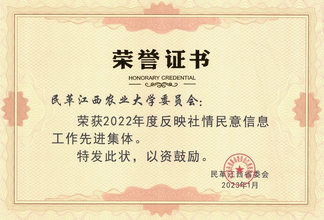 近日,民革中央、民革江西省委会分别对在2022年度参政议政工作中作出突出贡献的先进集体和先进个人予以了表彰。民革欧冠官方网站委员会荣获3项由民革省委会颁发的团体奖项,分别为“参政议政工作先进集体”“反映社情民意信息工作先进集体”和“喜迎中共二十大 助力‘六个江西’建设我为赣鄱献一策”金点子征集活动优秀组织奖;民革党员5人次分别荣获民革中央和民革省委会参政议政先进个人表彰,其中魏洪义主委荣获“民革全国参政议政先进个人”,宋小珍副主委获得了“民革江西省参政议政先进个人”等称号。