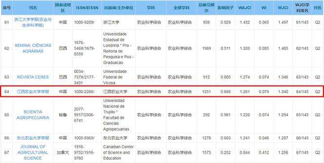 《WJCI报告》是由中国科学技术信息研究所、中国知网、清华大学图书馆、万方数据有限公司、中国高校科技期刊研究会、中国科学技术期刊编辑学会联合研制的期刊评价报告,并入选“科创中国”项目库。该报告旨在建立全新期刊评价体系,全面评价科技期刊对全球科技创新活动提供的出版传播服务及其学术影响力,是一份体现世界期刊同台竞技结果的期刊评价报告。《WJCI报告(2022)》共收录全球科技期刊约1.5万种,中国科技期刊入选数量为2 285种,其中“农业科学综合”学科类期刊共143种,《欧冠官方网站学报》排名为64,入选期刊均被认为是具有地区代表性和学科代表性的优秀期刊。