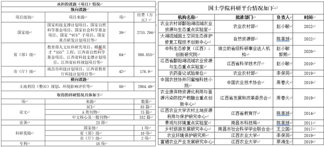 2011年至今,国土学院获批10余项省级及以上科研平台。其中,由赵小敏教授团队牵头申报的“鄱阳湖流域农业资源与生态重点实验室”经过10多年的发展从省级重点实验室成功获批为农业农村部重点实验室(部省共建),近年来依托实验室平台,产出大量科研成果,服务地区发展;由周春火教授牵头的井冈蜜柚科技小院自创立以来已培训果农达200余人,解决实际问题30余项,下乡服务55次,帮扶果农50人次,其中贫困户占40%,先后被人民日报海外版、江西日报等多家媒体关注报道并荣获“十佳中国农技协科技小院”称号“全国最美科技小院”称号。2016年以来,学院在科技支农中不断创新方式方法,依托“重点实验室”,“科技小院”等科研平台,产出科研成果,并让科技创新成果更好地服务地方经济发展。