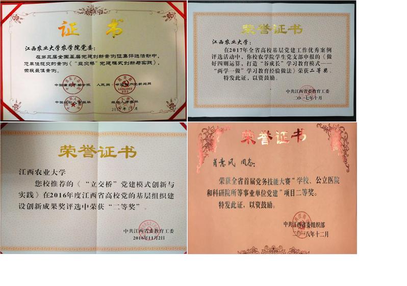 党的十八大以来,农学院党委在“立交桥”、“谷成长”党建理念和工作模式的导航下,组织建设取得了一系列成果。农学院领导班子连续8年获评欧冠官方网站优秀领导班子,学院党委曾荣获全省教育系统“创先争优先进基层党组织”、“全省先进基层党组织”称号。2012年,学院植保系党支部荣获全省“高校先进基层党组织”称号;2019年,学院农学系党支部入选第二批新时代高校党建示范创建和质量创优“全国党建工作样板支部”创建单位,2022年上半年已顺利通过验收,该支部获评2021年“全省先进基层党组织”称号。农学院教师荣获“江西省五四青年”奖章、“新时代赣鄱先锋”、“新时代学生心中的好老师”、“五一巾帼标兵”、“感动江西教育年度人物”、“江西省乡村振兴青年先锋”、“江西省优秀科技特派员”、“全国南繁工作先进个人”、“全省粮食工作先进个人”、“全国模范教师”、“全国优秀教师”、“江西省模范教师、教学名师”、“全省高校优秀共产党员”等省级及以上荣誉和称号60余人次,作物遗传育种团队荣获江西省委教育工委“工人先锋号”称号,作物生理生态与遗传育种教育部重点实验室荣获“全国教育系统先进集体”称号。2014年,学院党员活动室获评“江西省高校示范性党员活动室”。