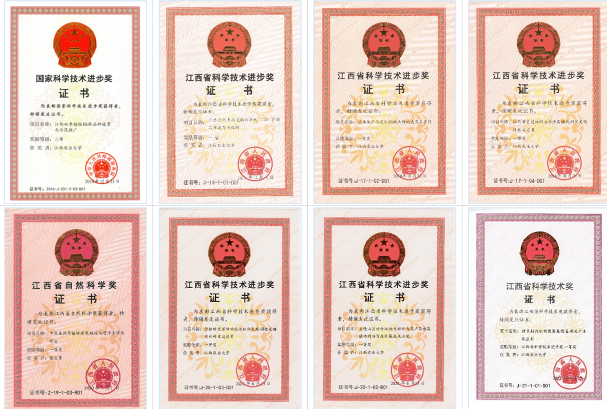 技术研发取得重大突破,关键核心技术达到领先水平。长期以来,黄路生院士团队聚力攻克猪遗传改良和种源“卡脖子”核心技术,鉴别的家猪主要经济性状因果基因突变占全球1/3,在国际上率先创建了多肋、体长、肉色、系水力、优质猪肉等多项专利技术,牵头创制的家猪育种芯片“中芯1号”各项性能处于世界领先水平并成为华系种猪育种主流技术,该成果入选为2021年江西省十大亮点科技成果。十年来,江农人奔走于实验室与田间地头“寻”良种、“觅”良法。累计选育水稻新品种70余个,其中国审品种8个、农业农村部认定的超级稻新品种5个,并研发了系列双季稻高产优质高效栽培技术。先后选育了果皮光滑型脐橙、毛花猕猴桃、厚壁毛竹、高产花生等特色植物新品种20余个;在生猪精准营养、林地地力提升、林业资源高效利用等领域关键技术研发相继取得突破。十年来,全校获得各级各类科研成果奖励100余项,其中作为牵头单位获国家科技进步奖二等奖1项,江西省科学技术奖一等奖7项。