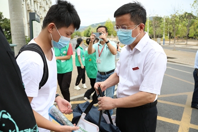 “同学们辛苦了”“你们是从哪里来的”“报到手续都办好了吗”“学校今年的毕业生,3个人当中就有一个考上研究生的,大家来到学校后也要好好学习”迎新期间,校领导来到校园各个迎新点,看望慰问迎新工作人员、志愿者、新同学及家长。校领导感谢迎新工作人员和志愿者的辛勤付出,感谢家长们把孩子托付给学校,寄语新同学拼搏奋斗、学有所成。