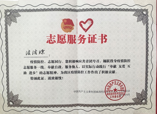 在经开正荣府社区,机关第九支部法洁琼同志作为一名党龄12年的“老”党员,主动向社区表明身份,积极加入抗疫志愿队,热情细致做服务,耐心有序做疏导,斗志昂扬做志愿,当好信息采集员和试管打包员,做好核酸检测秩序维护,累计志愿服务10余次,保障了核酸检测秩序井然、信息采集准确无误、邻里防疫和睦融洽,受到了经开区团委高度肯定和表扬,并获得志愿服务荣誉证书。