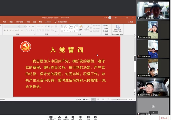 工学院学生第三党支部通过腾讯会议开展“赓续英烈精神,汲取奋进力量”主题党日活动。支部全体党员、入党积极分子共同观看《见证初心和使命的“十一书”——夏明翰的就义诗》片段,重温入党誓词,震撼每一位党员心灵。支部书记刘艳婷以《赓续英烈精神,汲取奋进力量》为题讲专题党课,分享夏明翰短暂而光辉的革命故事,感悟革命先烈对理想信念的坚定追求、对国家民族的深沉大爱。