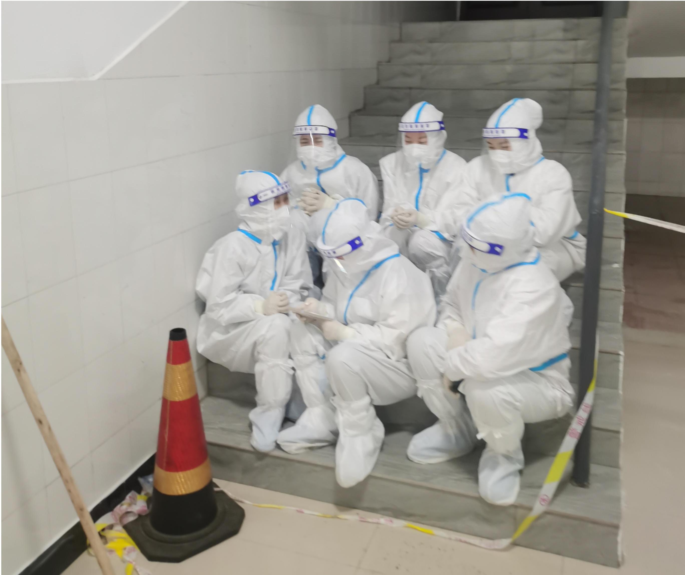 3月17日,在东区核酸检测点,在场所有人都被医护人员的话深深感动。由于试剂紧张,几位医护人员只能在现场等待。当晚气温骤降10度,东区管委会主任高鹏发现后,让在楼梯间依偎取暖的医护人员到暖气的屋子休息,她们却说:“同学们都在外面冒着寒风等,我们在室内已经好很多了。”因为害怕污染房间,她们一直都待在楼梯间,足足四个小时。直到完成学校东区所有核酸检测,又马不停蹄地赶到学校本部进行支援。