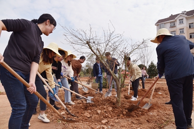 校领导带领师生协作配合,手持铁锹,从挖坑栽苗、培土浇水,每一道工序都认真完成,大家一边植树,一边了解树木品种的相关知识。通过共同努力,累计栽下了香樟、樱花、桂花、茶花等70余株。整个植树活动现场呈现一片热火朝天的劳动景象,大家挥汗如雨,看着种下的树苗,都露出开心的笑容。植树节期间,学校还开展了校园“补绿添彩”、班级团支部认养树苗、植物讲堂等丰富多彩的活动。