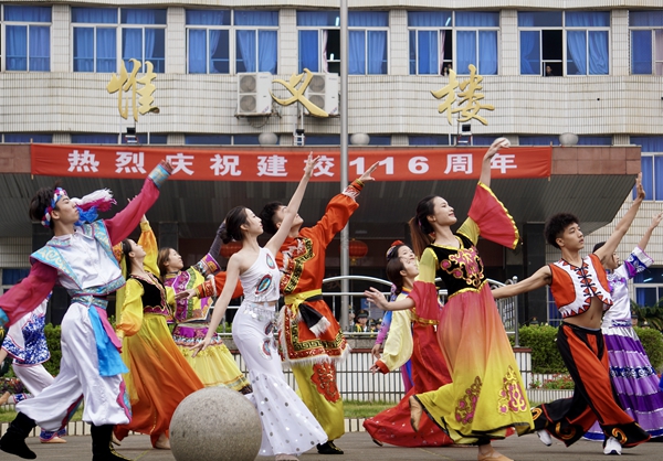 食品学院陈心仪代表学生发言。随后,师生们现场表演歌舞为母校庆生。“红日升在东方 其大道满霞光,我何其幸 生于你怀 承一脉血流淌……”一首由大学生艺术团带来的歌曲《万疆》,在饱含深情,荡气回肠的歌声中,仿佛置身那个时代,勉励当代青年人珍惜当下,发愤图强。身着民族服装的舞者,一曲《站在草原望北京》,展现了农大学子积极向上的精神面貌,大学生军乐团还进行了暖场的表演。