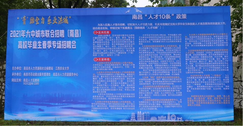 推进学生留赣留昌就业。学校充分利用展板、新媒体宣传南昌“人才10条”政策,并联合南昌市人力资源服务中心、高新区及小蓝园区就业服务局,邀请优质在昌企业参会,为其开辟招聘专区。为吸引更多毕业生留昌留赣,学校积极邀请在赣在昌优质企业进校招聘,参会单位中省内企业达199家,占总参会企业数的54.37%。