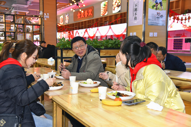 2月11日,农历大年三十,是中华民族阖家团圆的日子,但是今年由于疫情零星散发,家住中高风险地区的同学选择在学校过年,为了让同学感受家一般的喜庆和温暖,校领导赵小敏、贺浩华、邱晓辉、曾志将来到学生中间,了解学生的生活和学习情况,与留校学生同吃团圆饭,并给每位同学发新春红包,共迎新春佳节。