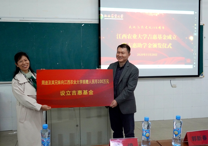 校庆日当天,周逵先生及其兄妹为学校捐资100万元,设立吉惠基金。其中,吉惠助学金专门用于资助贫困大学生,向他们传递一份鼓励和温暖。这是学校贫困学子的一个惊喜,更是广大江农子弟情系校园,关心支持学校发展的体现。