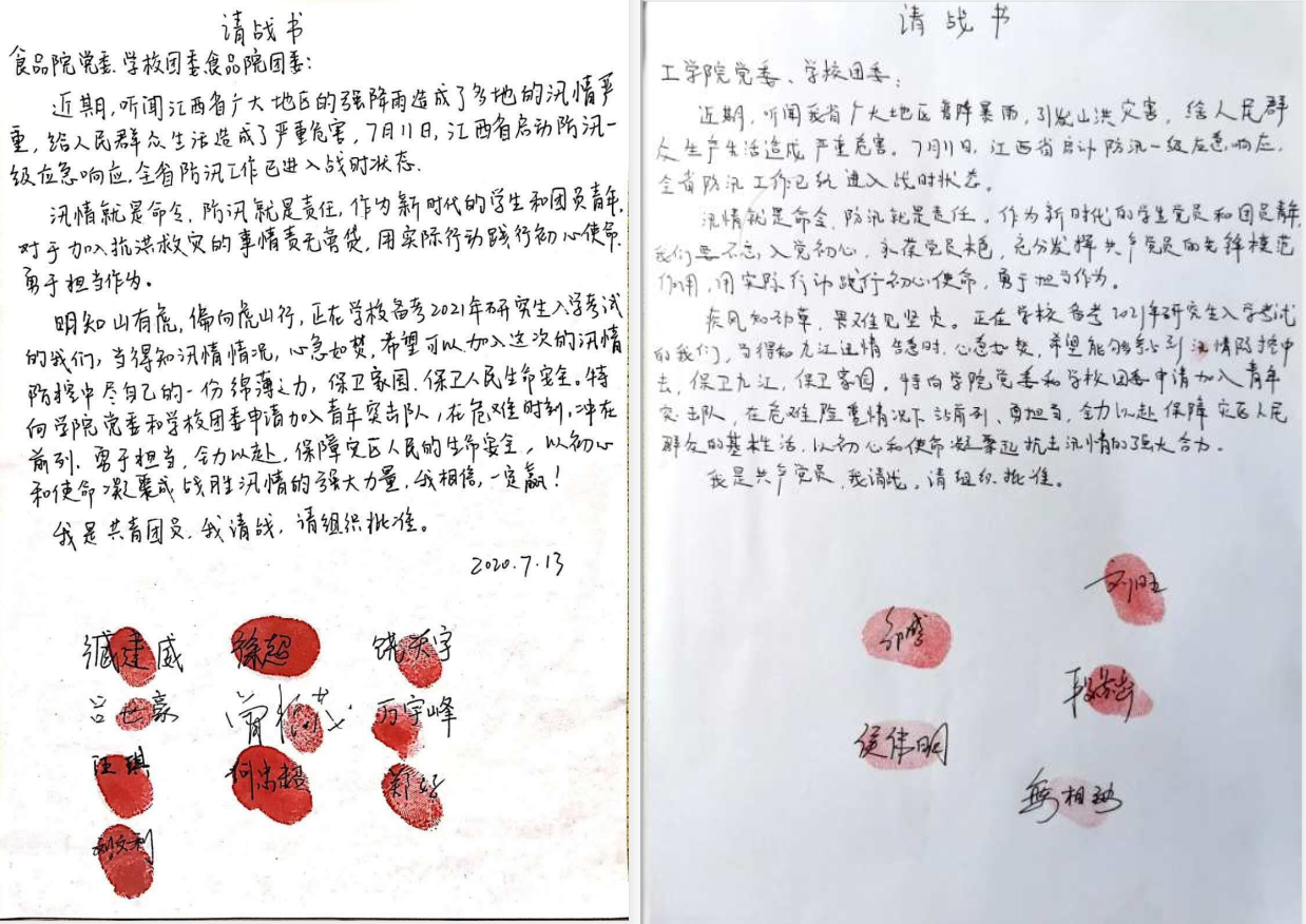 这是工学院正校备考研究生的大三青年团员刘旺、侯伟明等五位同学向工学院递交的一封防汛救灾请战书,上面的五个红手印,令人动容。与此同时,食品院、理学院也都收到了来自江农青年的“请战书”。