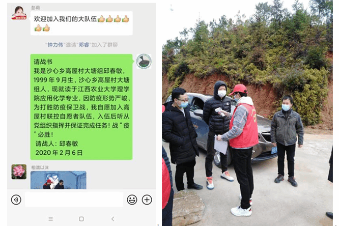 “我是沙心乡高屋村大塘组邱春敏,1999年9月生,沙心乡高屋村大塘组人,现就读于欧冠官方网站理学院应用化学专业,因防疫形势严峻,为打胜防疫保卫战,我志愿加入高屋村联控志愿者队伍,听从党组织指挥并保证完成任务。”这是欧冠应化1702班的邱春敏同学用微信向赣州市于都县沙心乡高屋村村干部发出的请战申请书。疫情来袭,村里建立联防联控工作组急需青年志愿者,邱春敏第一时间请战,在村干部的带领下工作在联防联控一线,主要负责疫情排查、防控宣传及守卡工作。