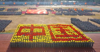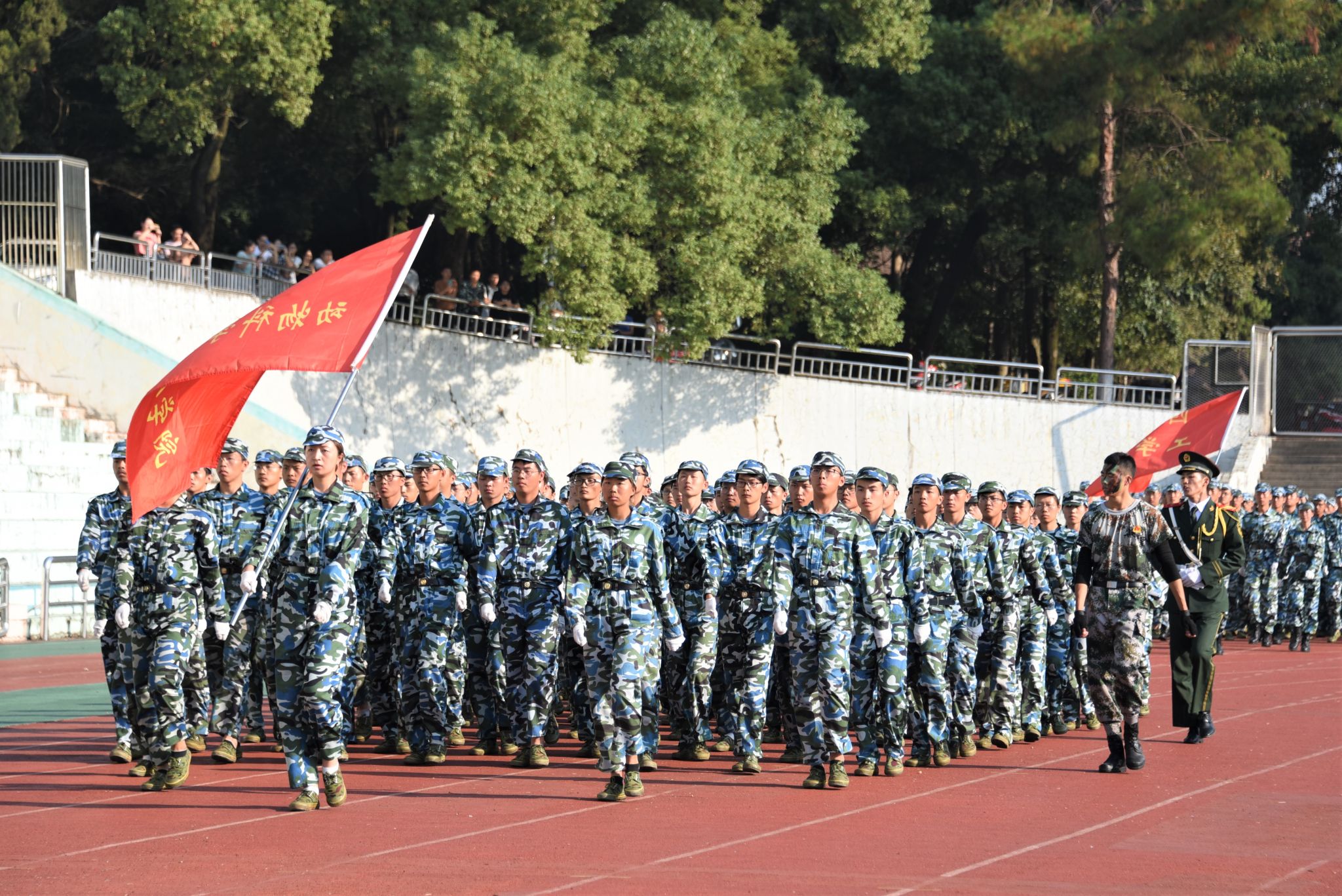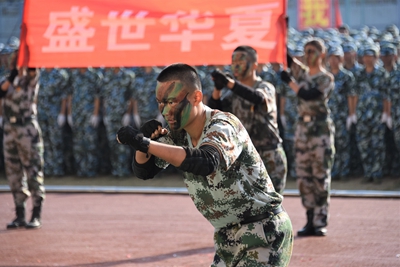 展演连队开始军体拳、刺杀操、盾棍术及队形的演练,同学们斗志高昂,配合默契,出拳虎虎生威,踢腿凌厉有力,精彩的展示赢得现场师生的阵阵掌声。各方阵变换队形,依次摆出了“1949——2019”“70”“不忘初心、牢记使命”等字样和国旗等图案,实力表白伟大祖国。
