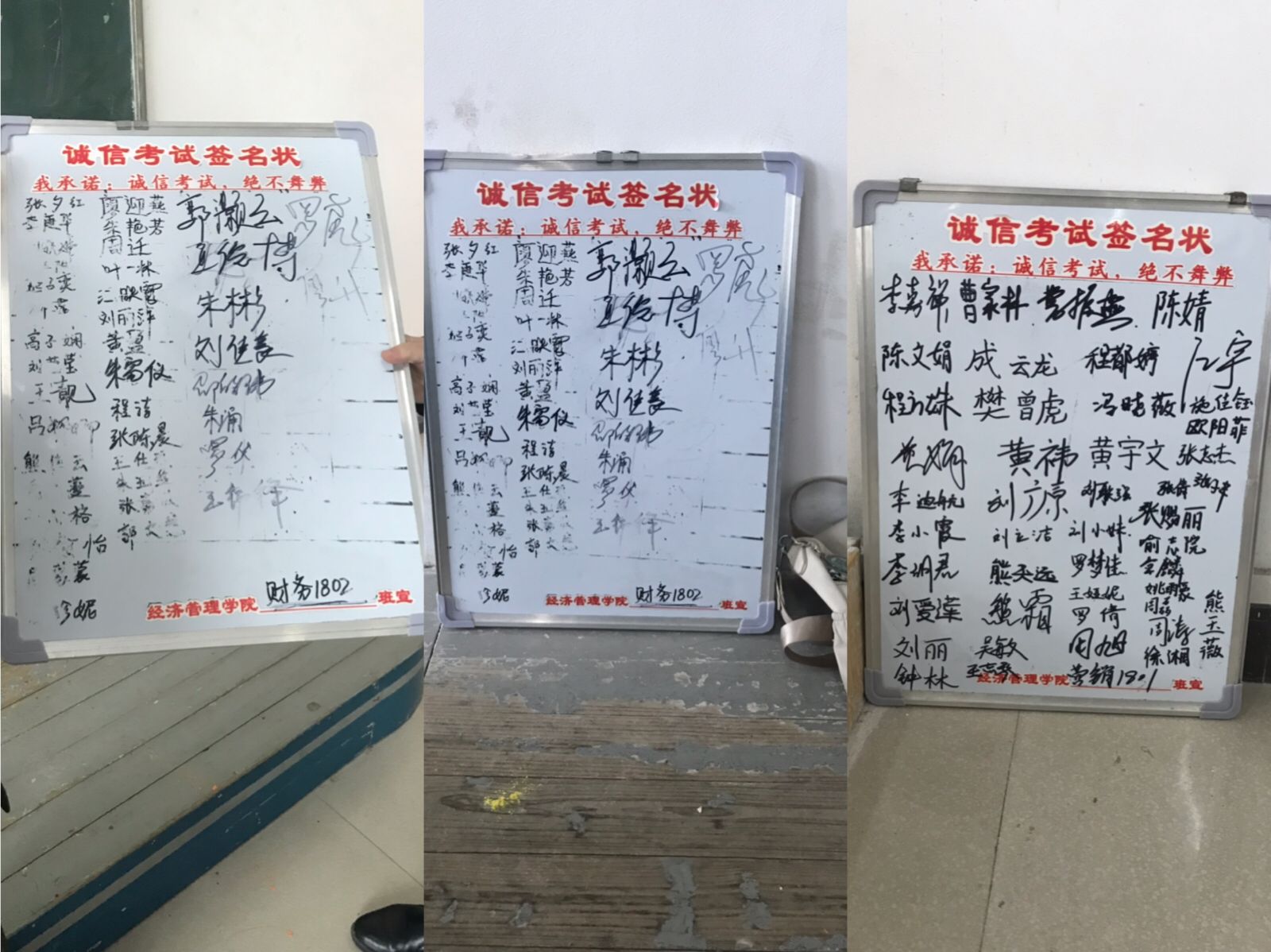 校领导对良好的考场秩序给予了高度肯定,并强调期末考试是学校教学工作的重要环节,相关部门务必要为学生营造良好的考试环境。校领导明确,为避免代考现象发生,学生应考必须出示身份证和学生证(具有完善学籍注册信息),各学院要进一步加强学生的诚信教育,确保期末考试无违纪情况发生,同时对部分学院在考场悬挂诚信考试横幅、学生签署诚信考试承诺书现象给予高度肯定。