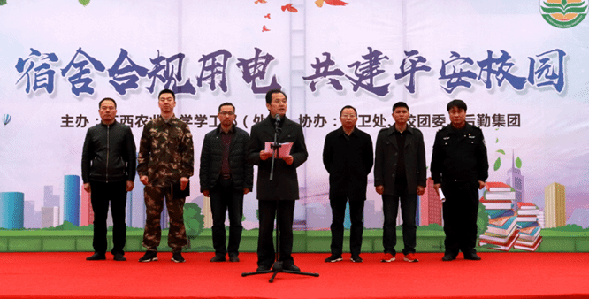 为进一步提高学生宿舍用电安全意识和防火自救能力,营造和谐平安的校园环境,12月25日,全校“宿舍合规用电,共建平安校园”主题“消防安全日”启动仪式暨消防教育演练活动举行。副校长许斌华,学工处、保卫处、校团委、后勤集团及经开区消防大队相关负责人出席启动仪式。1000余名学生参加消防教育演练。