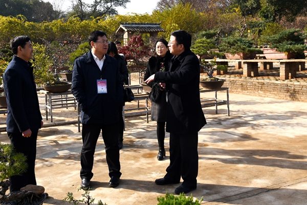 冯江与专家组成员开展集中考察。图为专家在盆景园考察。