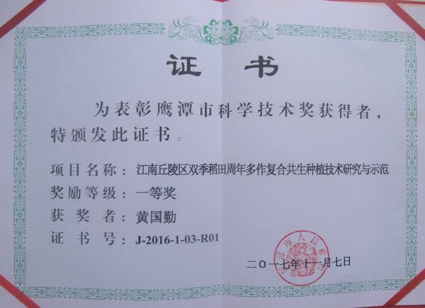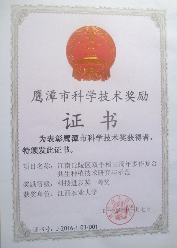 2017年11月7日,鹰潭市召开“全市科学技术奖励暨科技创新大会”,由欧冠农学院黄国勤教授主持完成的“江南丘陵区双季稻田周年多作复合共生种植技术研究与示范”科技成果,荣获2016年度鹰潭市科技进步奖一等奖。