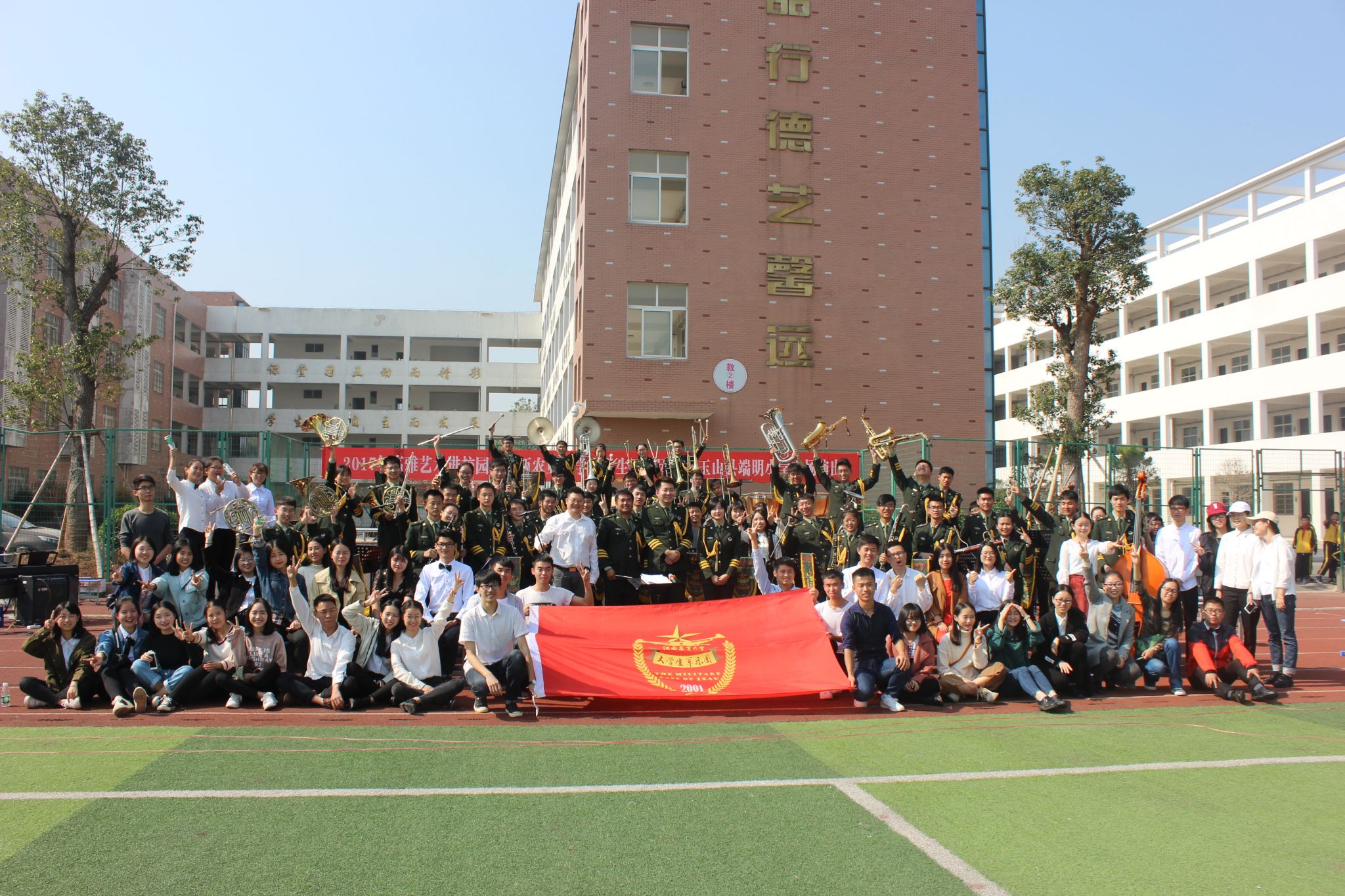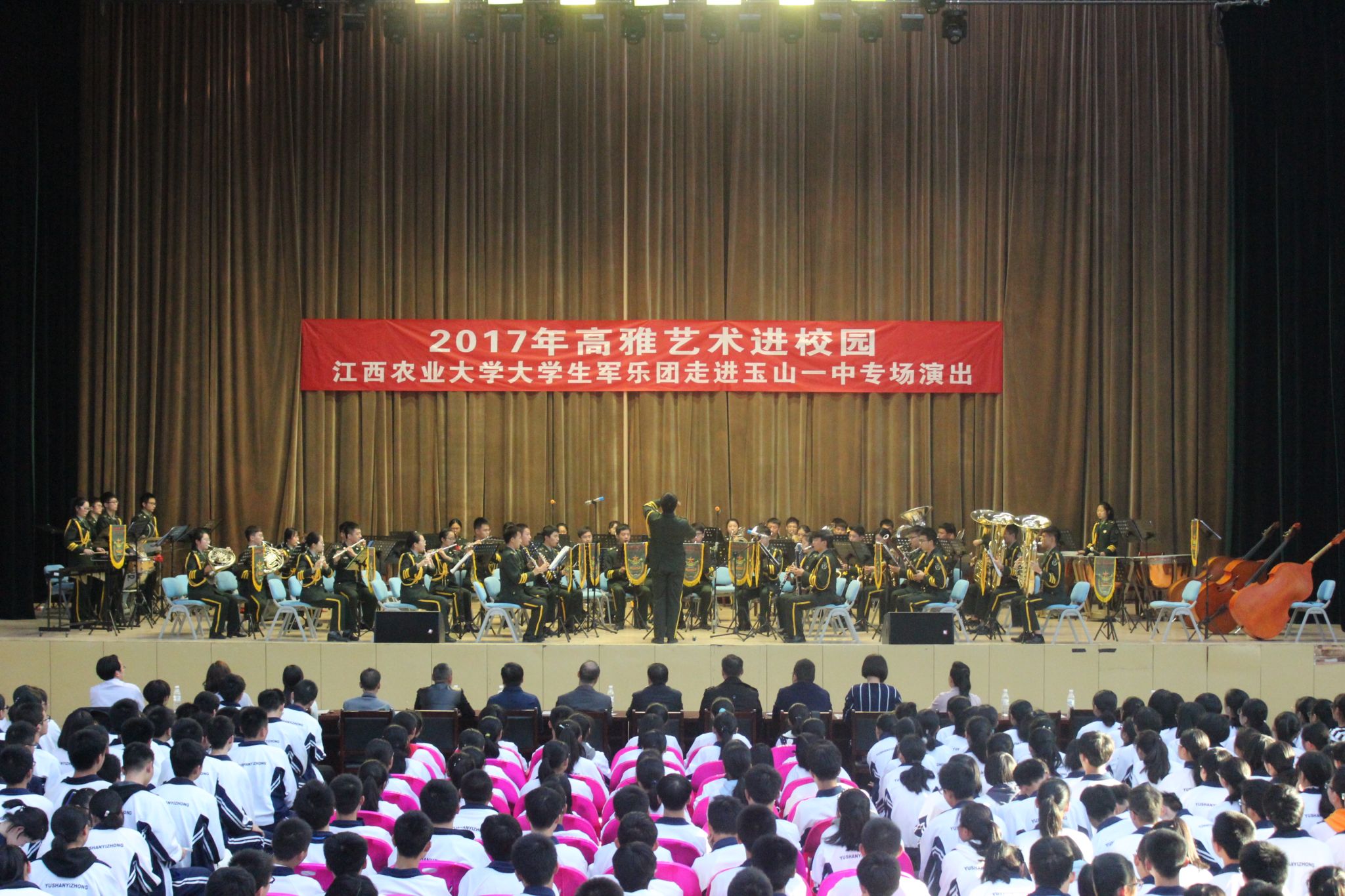 10月29日至11月3日,由省教育厅主办,欧冠大学生军乐团承办的2017年江西省高雅艺术进校园活动专场音乐会先后走进南昌工学院、江西信息应用职业技术学院、玉山一中、玉山瑾山小学和玉山端明小学,为10000余名师生送上了一台台视听盛宴,受到了各院校领导、现场观众、校友和社会的一致好评。