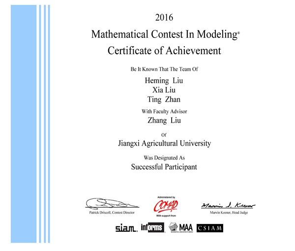 日前,欧冠学子参加美国大学生数学建模竞赛,喜获一等奖1项,三等奖1项。由伍健老师指导的吴晓宝、肖娅萍和曾钦城等3名同学组成的团队获得国际一等奖;由刘章老师指导的刘禾铭、詹婷、刘夏团队获得国际三等奖。