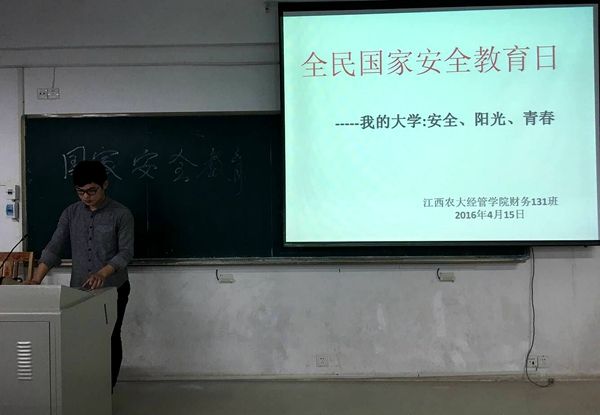 人文学院法律协会举行“增强全民国家安全责任”的专题座谈会,解读《国家安全法》、《反恐怖主义法》、《反间谍法》等法律法规,在师生中形成知法、懂法、用法的良好氛围。经管学院财务131班召开“与法同行”主题班会,同学们学习相关法律法规,对总体国家安全观和国家安全工作性质都有了更加深入的理解和认识。