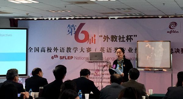 总决赛以说课(含评委提问)的形式进行。在十分钟的全英文说课环节,刘婷老师围绕一篇商务英语文章,首先向评委阐述了自身的有关商务英语教学的教学理念和教学目标,然后具体说明了如何结合语言和商务两个层面设计教学活动。她的说课过程思路清晰,语言流畅,充分体现了以学生为中心和基于内容开展教学的教学理念。凭借着两个阶段的优异表现,刘婷老师最终以决赛和总决赛总分第三名的成绩荣获此次赛事全国一等奖。