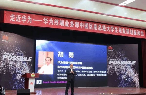 胡勇以精彩的演讲引爆全场学子的热情。他回顾了华为作为首家进入“最佳全球品牌”排行榜的中国企业的辉煌发展历程和取得的瞩目成绩,阐释了华为未来发展中的全球布局和战略构想,并介绍了华为“以客户为中心,以奋斗者为本,长期坚持艰苦奋斗、自我批判”的公司文化,提出“我们是来寻找合伙人”的理念。