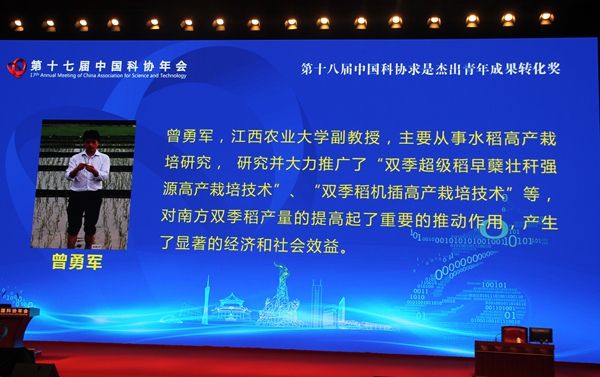 5月23日,第十七届中国科协年会在广州市隆重召开,国内外著名的专家学者,来自科研、生产、教学第一线的科技工作者共2500余人出席大会。年会开幕式对第八届周光召基金会科技奖和第十八届中国科协求是杰出青年成果转化奖获得者进行表彰,中共中央政治局委员、国家副主席李源潮为获奖者颁奖。经省科协推荐,欧冠农学院农学系主任、硕士研究生导师曾勇军副教授荣获第十八届中国科协“求是杰出青年成果转化奖”。