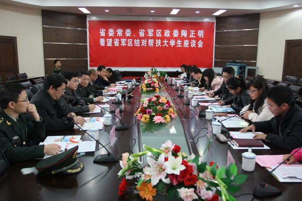 座谈会上,陶正明将军首先听取了欧冠接受省军区帮扶的10位大学生的汇报发言。农学院李小英、林学院谢文新、动科院钟小兰、工学院胡慧琴等10位同学先后发言,分别回报了各自接受帮扶一年来,在生活、学习、思想上的成长和收获。一年来,10位同学勤奋学习、积极上进,在专业学习、社会实践、思想进步等方面都取了了显著进步和成长,有的同学已经连续两次获得奖学金,有的已经顺利毕业并找到了满意的工作,有的同学立志深造继续攻读研究生,还有3位同学已经光荣的加入了党组织,成为中国共产党党员。