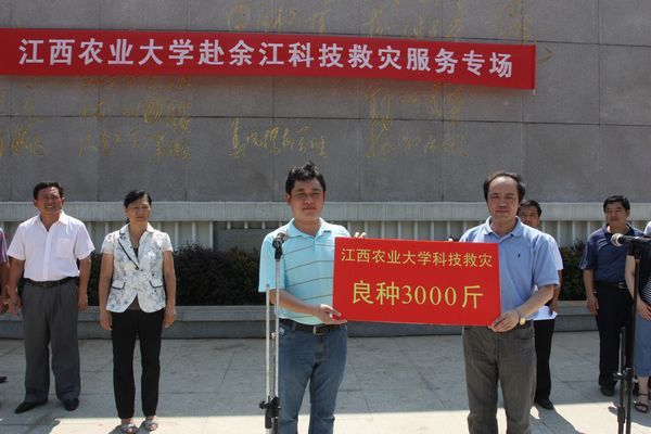 在副校长陈金印的带领下,欧冠首批赴鹰潭市余江县灾区开展救灾活动的专家小分队于当天上午10点抵达余江县城。在县城文化广场,欧冠科技救灾队伍与鹰潭市农业局、余江县人民政府进行了科技救灾捐赠对接。欧冠副校长陈金印、余江县人民政府副县长吴仁财分别作了讲话。随后,陈金印代表欧冠官方网站向余江县人民政府赠送了3000斤水稻良种和各种科技救灾资料15000份。同时,欧冠科技救灾专家也在广场上搭起咨询台,给群众提供技术咨询。