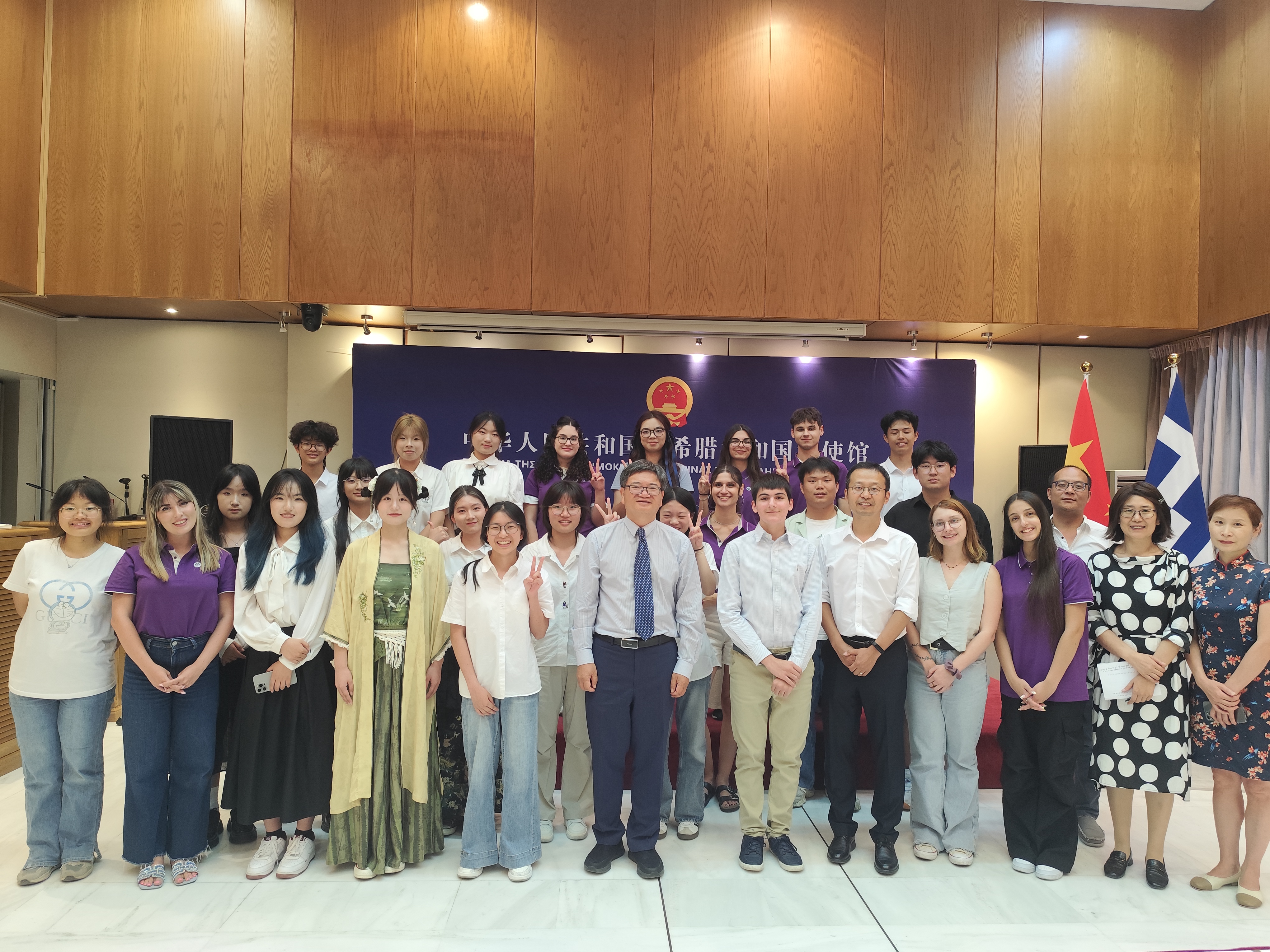 7月21日,欧冠暑期希腊学生研学团受邀参加中国驻希腊大使馆“青年π·互访互鉴”活动,中国驻希腊使馆公使衔参赞赖波出席活动并致辞。欧冠暑期希腊学生研学团与刚刚结束在中国访问的希腊华欣语言学校师生代表共同参加活动。