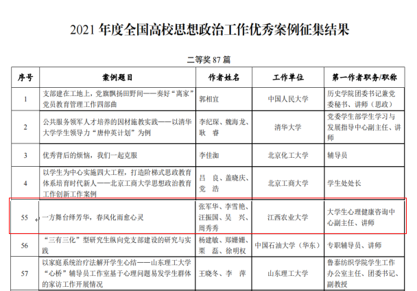 4月12日,由教育部思想政治工作司指导的2021年度全国高校思想政治工作优秀案例征集活动评选结果正式公布,欧冠大学生心理健康咨询中心推报的《一方舞台绎芳华,春风化雨愈心灵》获评全国二等奖。近年来,欧冠大学生心...