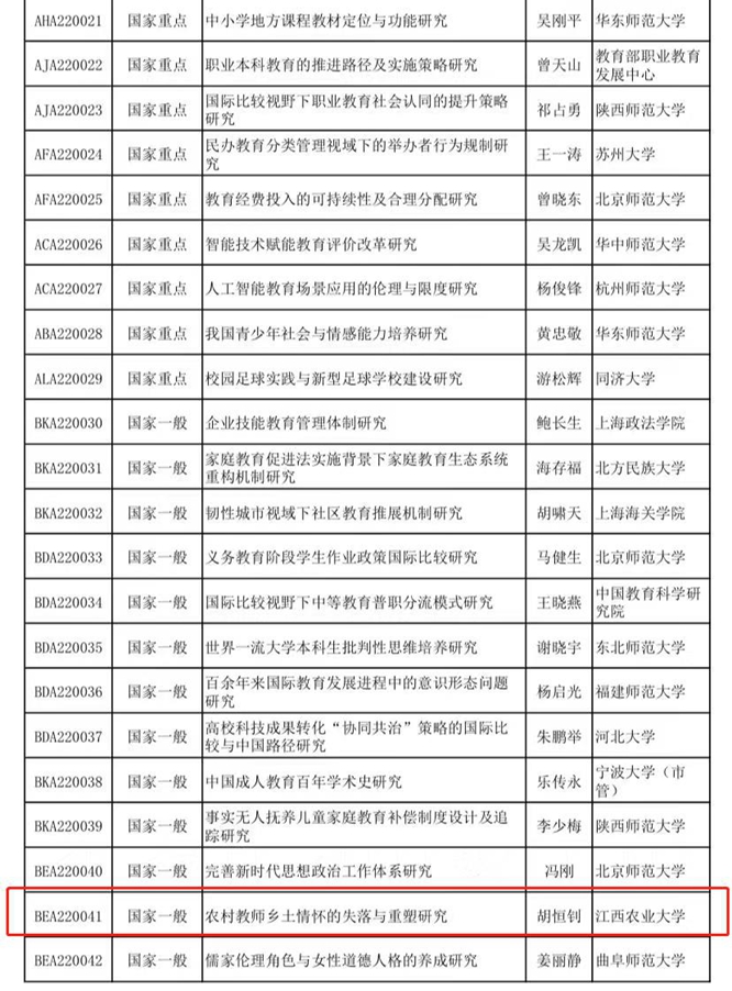 近日,全国教育科学规划领导小组办公室公布了全国教育科学“十四五”规划2022年度课题立项名单,由欧冠马克思主义学院副教授胡恒钊博士作为负责人申报的课题《农村教师乡土情怀的失落与重塑研究》,成功获批国家教育...
