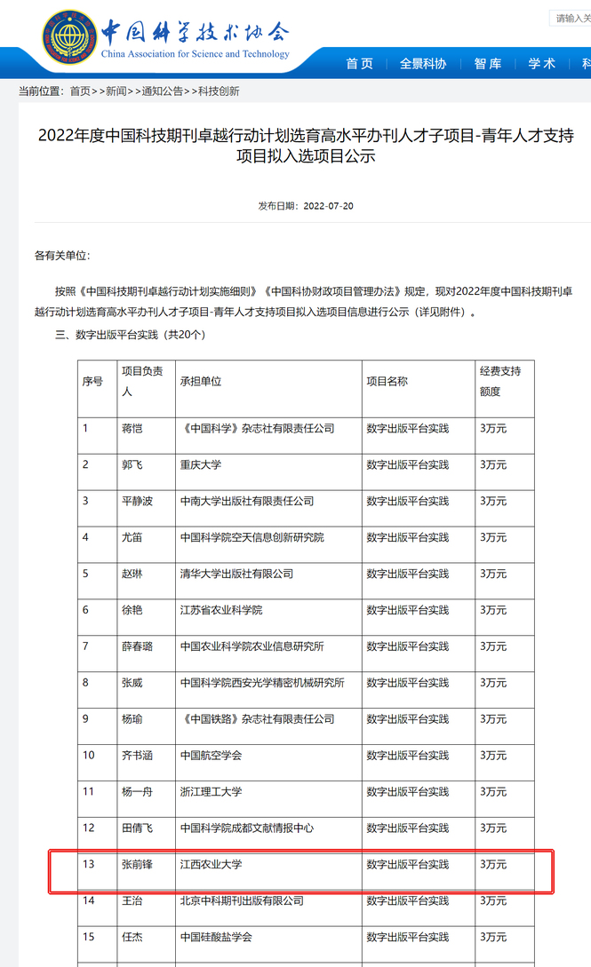 近日,中国科技期刊卓越行动计划办公室发布《关于下达2022年度中国科技期刊卓越行动计划选育高水平办刊人才子项目——青年人才支持项目入选项目的通知》,由欧冠期刊社《欧冠官方网站学报》编辑部张前锋编辑作为负责...