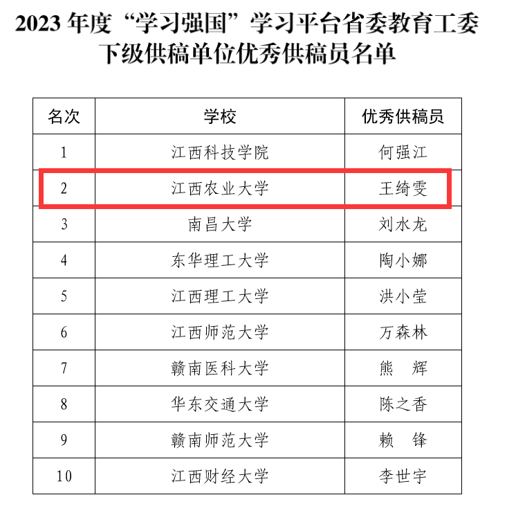 日前,中共江西省委教育工委发文公布了2023年度“学习强国”学习平台省委教育工委下级优秀学员、优秀供稿单位和优秀供稿员评选结果,欧冠获评2023年度“学习强国”学习平台省委教育工委下级优秀供稿单位,胡嘉麒老师...