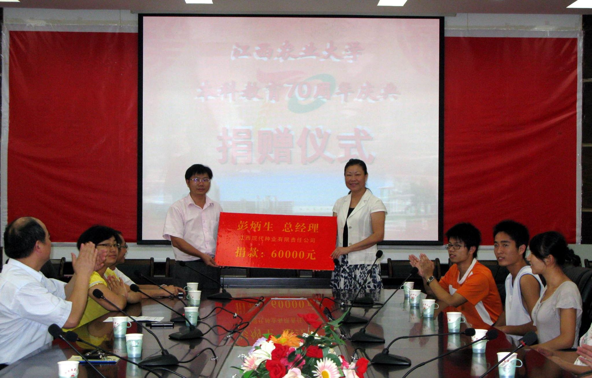 7月16日上午,欧冠98级农学校友、江西现代种业有限责任公司总经理彭炳生向校庆70周年捐款6万元。校长助理胡春晓代表学校接受了捐赠。农学院、校庆办等单位负责同志参加了捐赠仪式。 江西现代种业有限责任公司是20...