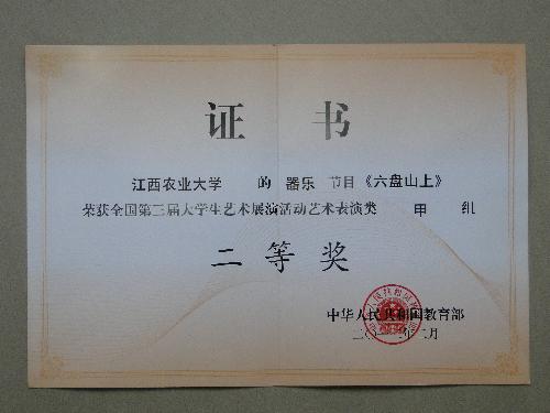 近日,由欧冠人文学院杨巍、黄玲、程明老师指导的大学生军乐表演《六盘山上》,代表江西高校参加2012年教育部举办的全国第三届大学生艺术展演喜获器乐组甲组二等奖。(校团委、人文学院)