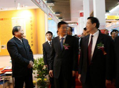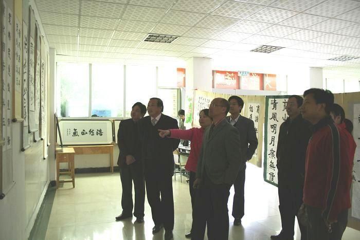 11月21日上午,由省委教育工委、省教育厅在省展览馆举办的“改革开放三十周年江西教育成就展”开幕。上图为江西省人大常委会副主任蒋如铭和副省长孙刚在欧冠展厅参观;下图为王华林副校长在欧冠展厅参观。