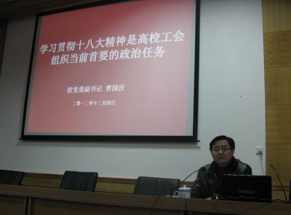 为了学习贯彻党的十八大精神,把全校工会干部的思想统一到十八大精神上来,12月4日,校工会举办全校工会干部学习十八大精神培训班,校党委副书记曹国庆应邀作宣讲报告。 曹国庆在报告中指出,学习贯彻十八大精神是高...