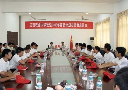 本报讯(肖意风)7月13日下午,大学生活动中心三楼会议室激情飞扬,气氛热烈,欢送2008年西部志愿者座谈会在此隆重召开。校党委副书记曹钟朗,党委组织部、党委宣传部、校团委、招生就业处负责同志,各学院学生工作、...