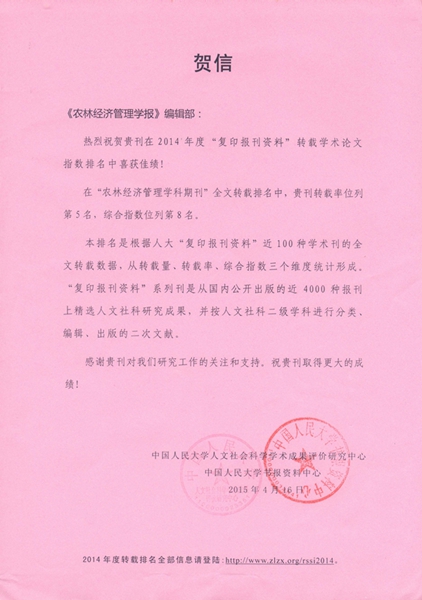 中国人民大学书报资料中心等给欧冠《农林经济管理学报》发来贺信