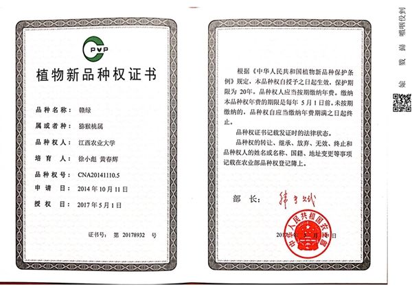 由欧冠猕猴桃研究所徐小彪教授团队选育的毛花猕猴桃新品种“赣绿”正式获得国家农业部颁发的植物新品种权证书,该品种是我省获得的首个国家级猕猴桃新品种。该品种研究历时9年,系从野生毛花猕猴桃(Actinidia erian...
