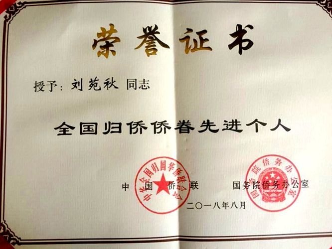 刘苑秋老师荣获“全国归侨侨眷先进个人”荣誉称号