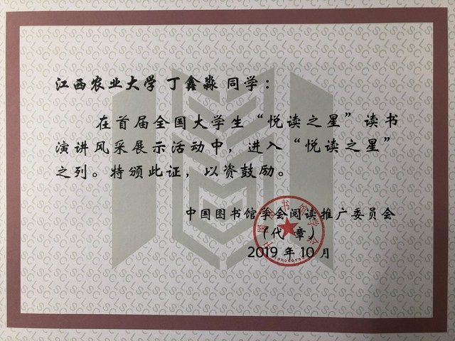 近日,由中国图书馆学会主办的首届全国大学生“悦读之星”读书演讲风采比赛结果公布,全国共100位选手获 “悦读之星”称号,欧冠图书馆推荐的植检1701班丁鑫淼同学获此殊荣。 首届全国大学生“悦...