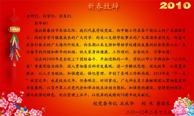 校党委书记石庆华、校长黄路生向全校师生员工暨海内外校友祝贺新春
